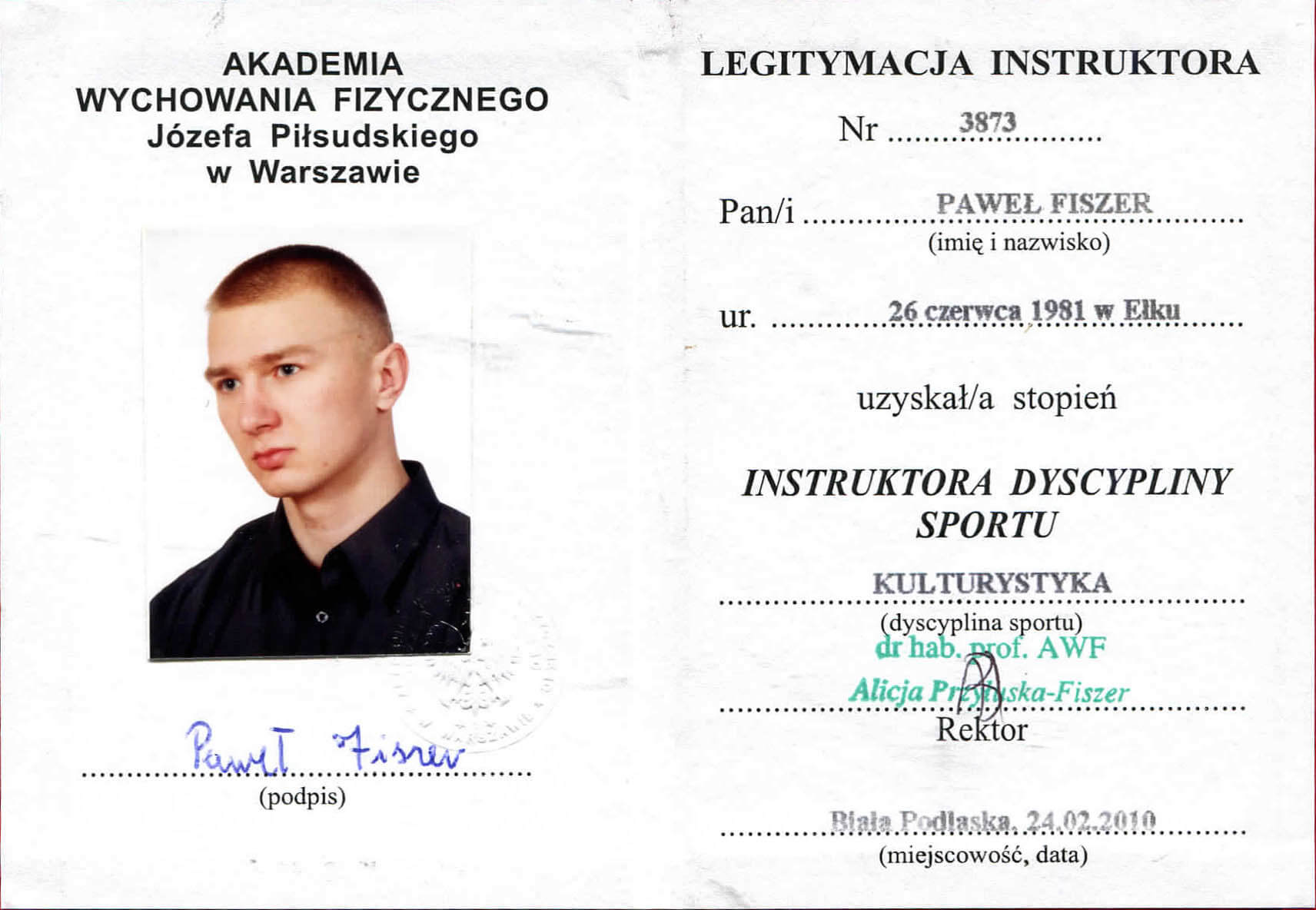 Legitymacja Instruktora pływania Dyplom ukończenia Akademi Wychowania Fizycznego Jóżefa Piłsudskiego w Warszawie Dyplom uzyskania Tytułu Zawodowego Certyfikat trenera personalnego Legitymacja trenera osobistego Legitymacja instruktora kulturystyki Legitymacja instruktora piłki nożnej Legitymacja instruktora boksu